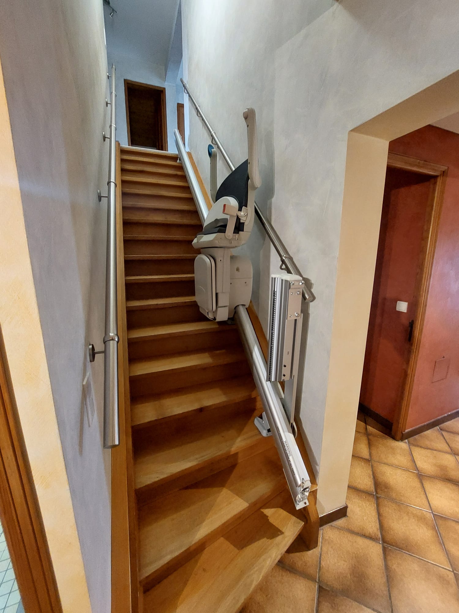 Ce siège adapté pour un escalier droit, est équipé d’un rail relevable électrique en bas de l’escalier.