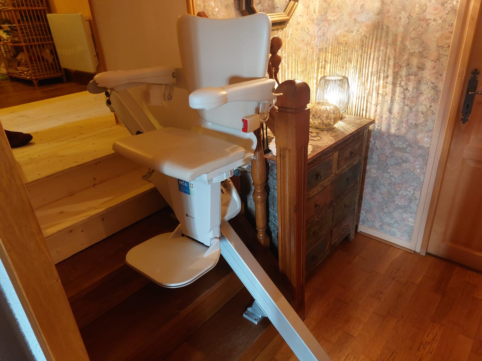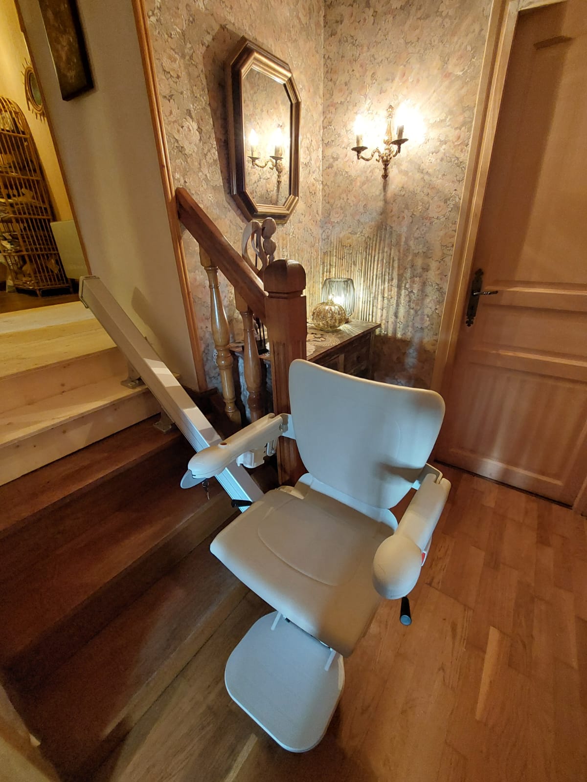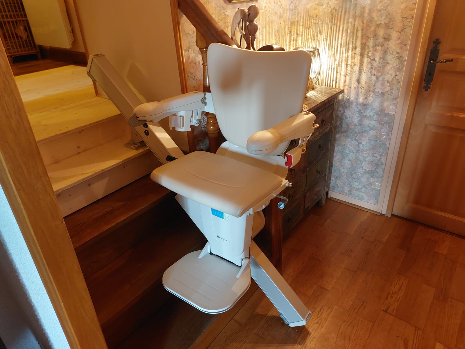 - Un pivot manuel en haut de l’escalier, permet de faire pivoter le siège sur le palier, afin de descendre en toute sécurité.