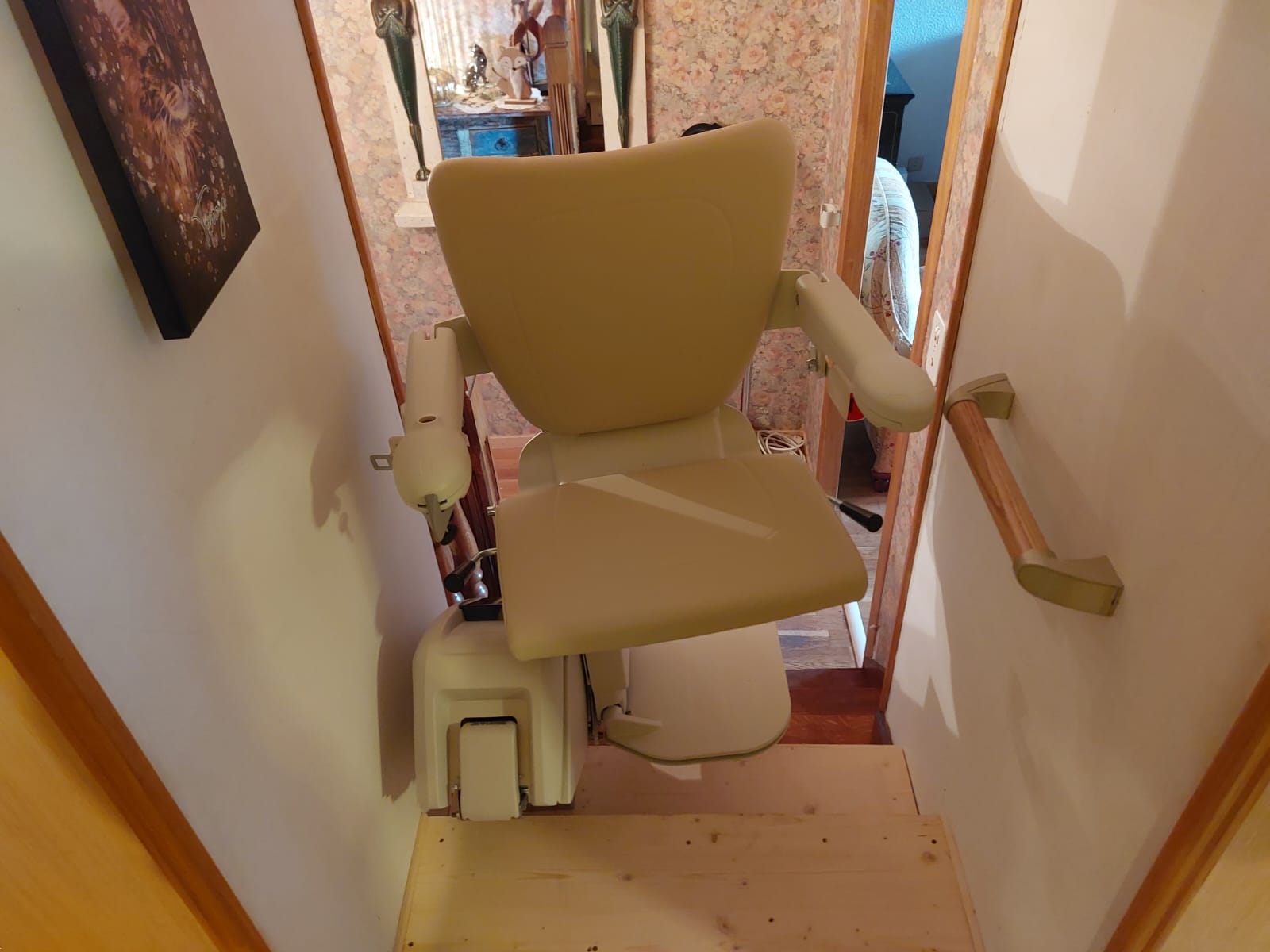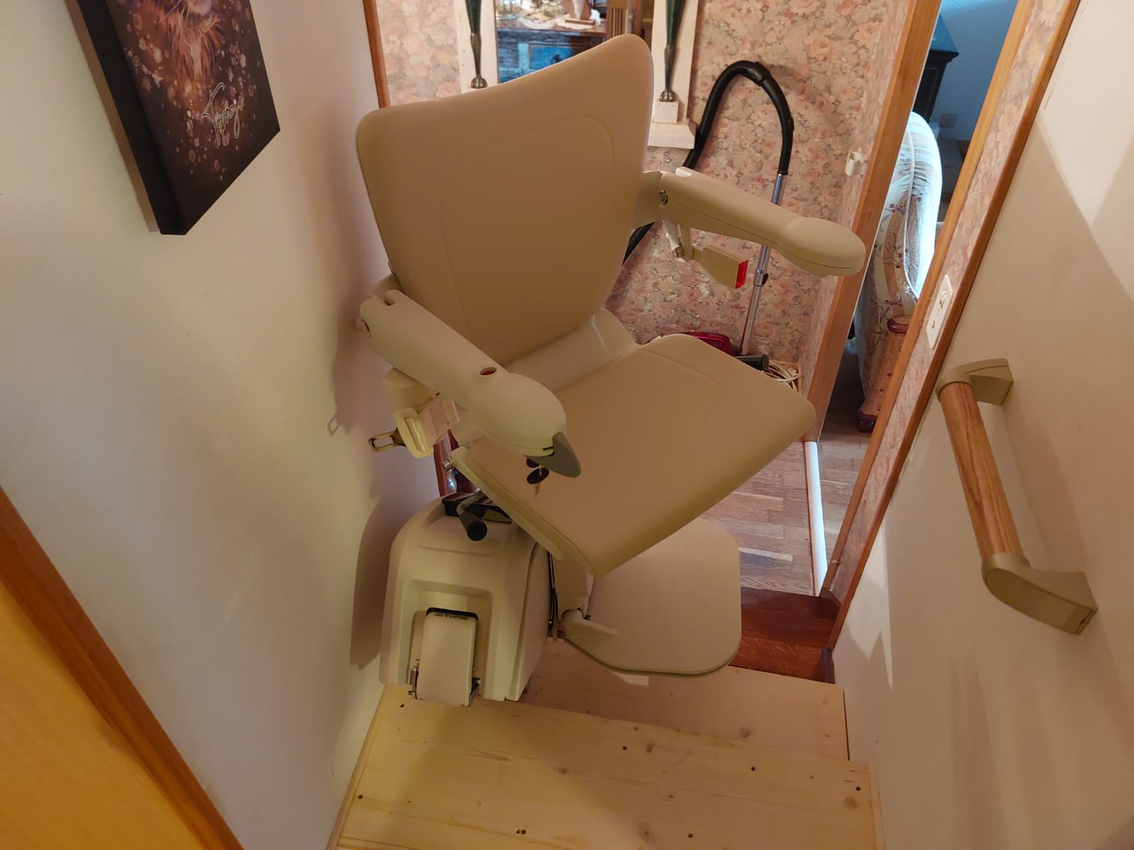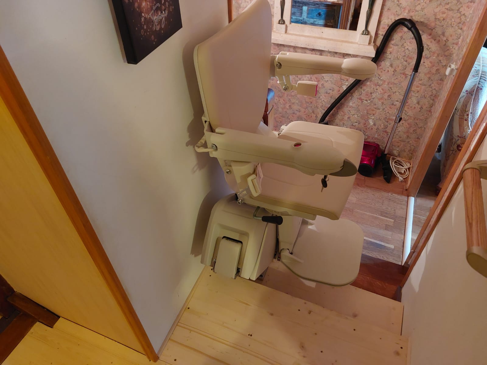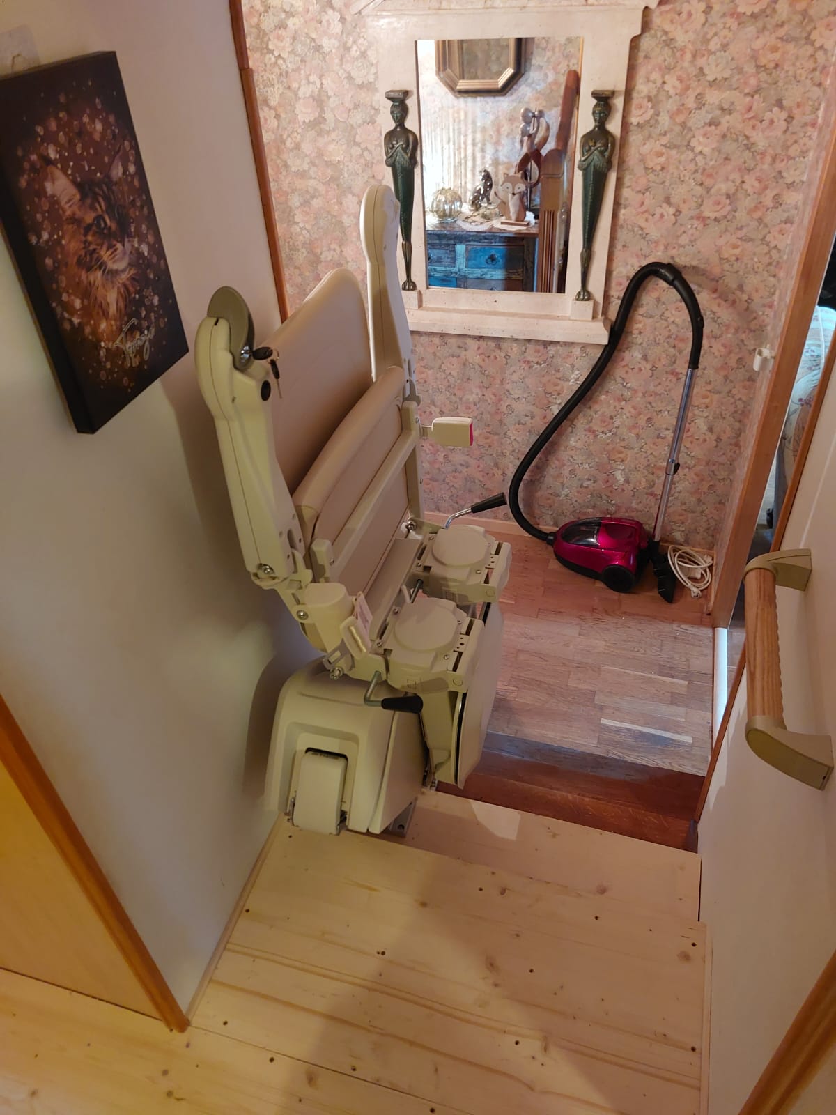 - Un pivot manuel en haut de l’escalier, permet de faire pivoter le siège sur le palier, afin de descendre en toute sécurité.